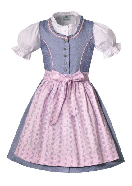 in Kürze: Kinder- und Jugenddirndl, Farbe: blau / lila, Blümchenstreuern, Posamenten- und Rüschenborte, silber farbene Knöpfe, Zierborten, Schürze mit vertikalen Rankenmuster, Dirndlbluse weiß, Spitzen- und Rüschenborte