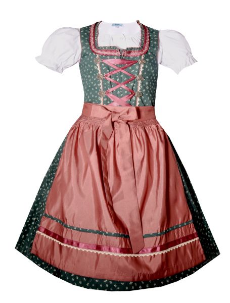 In Kürze: Kinderdirndl, Trachtenset, 3-teilig, Farbe: grün / dunkelgrün / altrosa / rosenholz, Rüschen, Borte, Miederhaken, Glanzband, Schürze in rosenholz, Dirndlbluse weiß